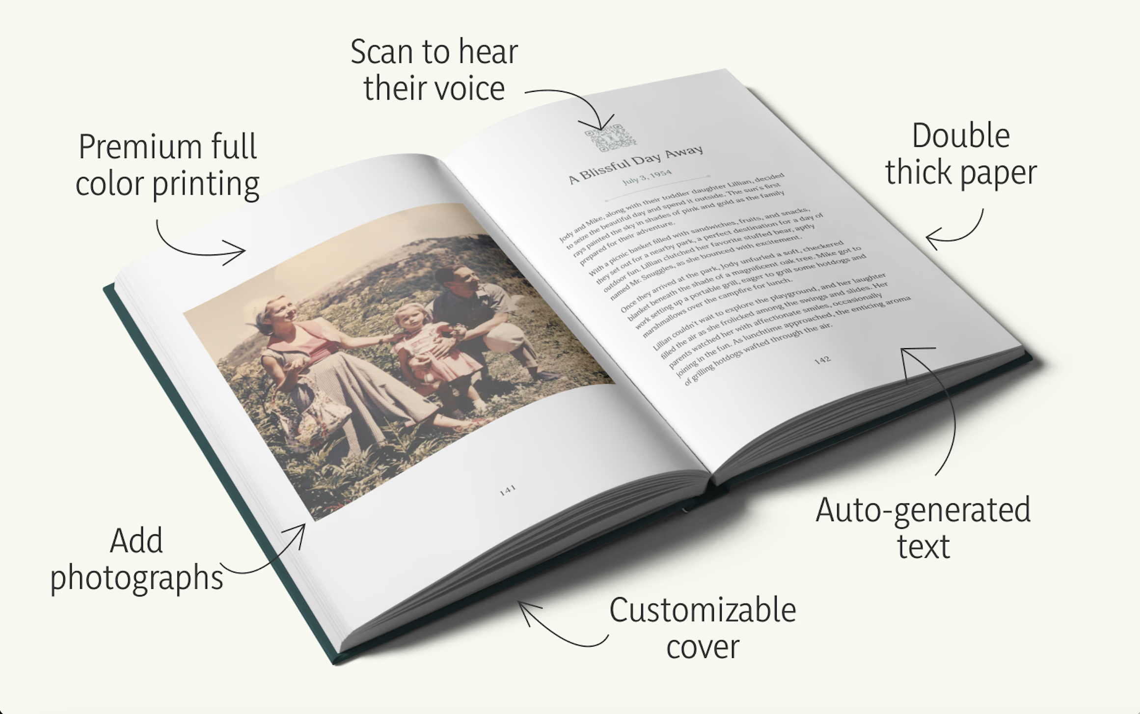 The real magic comes when your book is all ready — your loved ones will be able to enjoy your reflections on paper, plus they’ll be able to hear your voice recording of each prompt when they scan the QR code on the page. The result is a special archive that blends print with digital.