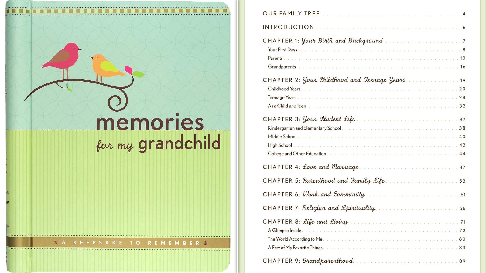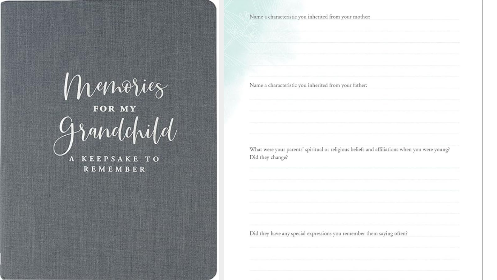 In addition to your memories, this cloth-covered, silver foil-stamped hardcover book asks about everything from your nuclear family’s genealogy (your grandchild’s great- and great-great-grandparents) to what was happening in the news during your youth, including how much things cost (which is sure to really trip them out). This memory book is addressed simply to a grandchild without specifying whether it’s from grandma or grandpa, which some might appreciate.