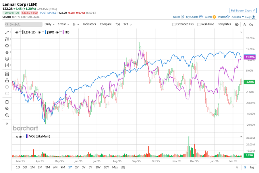 Shares of this leading homebuilder have underperformed the broader market over the past year. LEN has declined 1.2% over this time frame, while the broader S&P 500 Index ($SPX) has rallied nearly 11.8%. However, in 2026, LEN stock is up 19%,surpassing SPX’s marginal fall on a YTD basis.