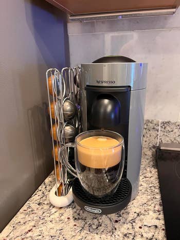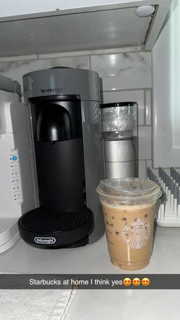 Promising review: "I love an iced white chocolate mocha latte, and now I can make them at home. I love the Nespresso machine so much that I use it every day. It is a little loud, but I don’t care. It makes the best espressos. The little tray is super easy to clean off and actually catches the drips at the end. I really like how the water container can move around to fit wherever you need it to go. It gets hot enough to melt the chocolate chips I put in my cup. This is great. It helps me save money on coffee, and I can tell it's pretty durable! I use it at least two times a day, and I’ve never had any issues with it opening or closing." —Kyra Malkowski