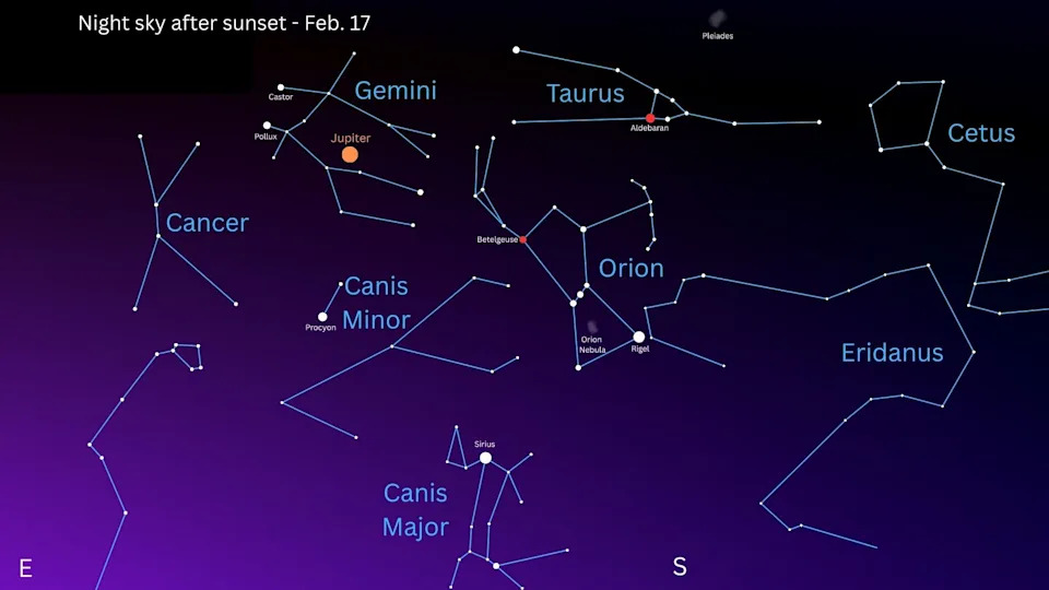 When you buy through links on our articles, Future and its syndication partners may earn a commission. The blissfully dark nights surrounding this month's new moon phase on Feb. 17 present a perfect opportunity to explore the wonders of the post-sunset realm while free of the glare cast by our natural satellite. A new moon phase occurs when the moon is positioned directly between the sun and Earth, meaning the moon isn't visible at night and is hidden by the sun's glare during the day. February's new moon phase occurred at 7:01 a.m. EST (1201 GMT), heralding the onset of a spectacular annular solar eclipse visible across a swathe of Antarctica, as the lunar disk passed in front of the sun, leaving only the "ring of fire" of its outer edge on display. Sadly, unless you're a penguin or an Antarctic researcher, you were unlikely to catch the eclipse for yourself today. Still, the new moon offers several nights of pristinely dark moonless skies, so grab your telescope and join us on a sightseeing tour of the mid-February night sky. Mercury will shine low in the west in the hour following sunset on Feb. 17, appearing as a bright "evening star" less than 20 degrees above the horizon. If you're incredibly lucky โ and have a clear view of the western horizon โ then you may be able to spot the steady light of Venus vying for attention in the glow of the setting sun below Mercury on Feb. 17, before it follows our parent star swiftly out of sight. Saturn will be visible less than 15 degrees to the upper left of Mercury. Its iconic rings are finally starting to reveal themselves after seeming to "disappear" in November last year, when they turned edge-on in relation to Earth, making them appear as little more than a thin line. Dark nights around the new moon phase are the perfect time to hunt twinkling constellations through the winter sky. Look to the left of Jupiter to find Castor and Pollux โ the two stars that represent the twins in the constellation Gemini. The gleaming star directly below Jupiter in the evening sky is Procyon, the brightest member of the constellation Canis Minor, the little dog. Sirius, the brightest star in the night sky, sits at the heart of Canis Majoris โ the big dog โ and can be found shining roughly 20 degrees to its lower right (roughly the width of two stacked fists held at arm's length), with the stars Wezen and blue Adhara forming its rear leg. Both stellar hounds hunt the night sky alongside their master, the hunter depicted in the constellation Orion, the colorful stars of which can be spotted to the upper right of Sirius in the hours following sunset on Feb. 17. Look out for the red giant star Betelgeuse, which marks the right shoulder of Orion and the blue supergiant Rigel, which marks the left foot. Between are the three familiar points of Orion's Belt, and hanging below that is the milky light of the Orion Nebula โ a colossal stellar nursery that orbits within the Milky Way roughly 1,500 light-years from Earth. To the right of Orion will be the red light of Aldebaran, the star which marks the eye of the great bull in the constellation Taurus. Notice a hazy patch of light to the upper right of Aldebaran? That's the Pleiades, a vast star cluster teeming with over a thousand blue-white stars, which makes for a magnificent target, whether you're viewing with the naked eye, binoculars, or a telescope. Next, look to the northeast to find the seven stars of the "Big Dipper" asterism standing on its end close to the horizon. Locate the two uppermost stars โ Merak and Dubhe โ and draw an imaginary line from the former through the latter and out into space. The next bright star you find will be Polaris, the "North Star", around which the entire sky appears to revolve. Continue following that line and look slightly higher to find the five bright stars of Cassiopeia, arrayed in a zig-zagging formation reminiscent of a sideways "W", or "M", which is said to portray a queen who was cast into the stars after falling foul of the Greek god Poseidon. Want to get a closer look at the night sky? Then be sure to check out our picks of the top binoculars and telescopes for exploring the planets and constellations, while photographers should read our selection of the best cameras and lenses for astrophotography. Editor's Note: If you would like to share your astrophotography with Space.com's readers, then please send your photo(s), comments, name and location to spacephotos@space.com.