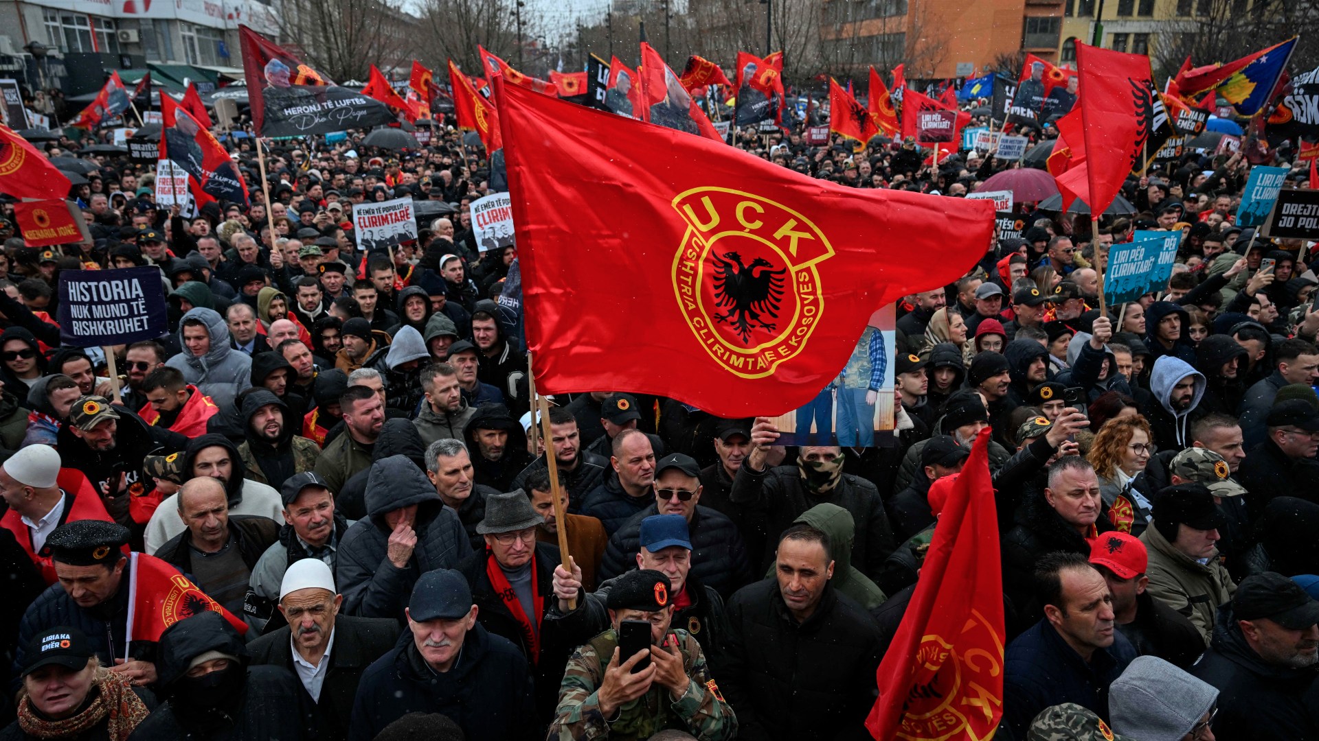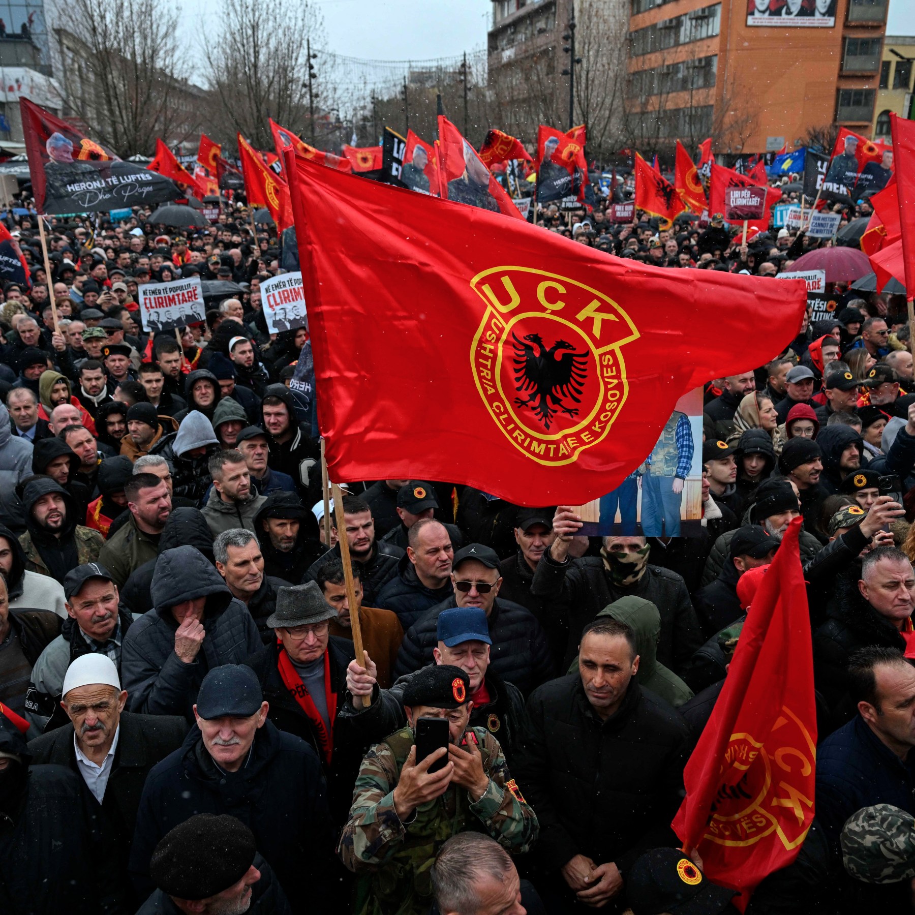 Former KLA leaders are seen by many in Kosovo as national liberation heroes. Many protesters wore KLA uniforms. Others waved KLA, Kosovo and Albanian flags. Supporters held placards reading, “Freedom has a name,” and held photos of Thaci and others captioned “Heroes of War and ⁠Peace”.
