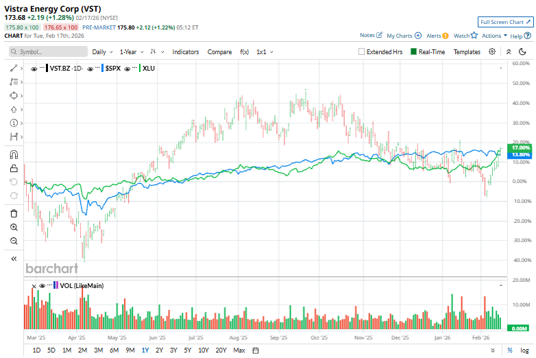 With a market cap of $58.1 billion, Vistra Corp. (VST) is a leading U.S. integrated retail electricity and power-generation company that produces, markets, and sells electricity and related energy services to residential, commercial, and industrial customers. Headquartered in Irving, Texas, Vistra operates one of the country’s largest competitive generation fleets alongside a major retail energy business serving multiple deregulated power markets. Shares of the electricity retailer have underperformed the broader market over the past 52 weeks. VST stock has soared 3.6% over this time frame, while the broader S&P 500 Index ($SPX) has rallied 11.9%. However, shares of the company are up 7.7% on a YTD basis, outpacing SPX's marginal drop. Cathie Wood Adds 210K Shares to a Rising AI Bet With Upside of 102% Is GOOG Stock a Buy Amid the Software Selloff? Broadcom Is ‘Sitting on a Sinking Iceberg.’ Why 1 Analyst Is Warning on AVGO Stock Here. Our exclusive Barchart Brief newsletter is your FREE midday guide to what's moving stocks, sectors, and investor sentiment - delivered right when you need the info most. Subscribe today! Looking closer, shares of Vistra have underperformed the State Street Utilities Select Sector SPDR Fund's (XLU) 17.3% rise over the past 52 weeks and 8.6% return in 2026. On Jan. 16, Vistra shares fell more than 7% as power-generation stocks broadly declined following reports that President Trump was pushing for an emergency wholesale electricity auction and measures to shift rising power costs onto large technology customers. For FY2025 that ended in December 2025, analysts expect VST's EPS to decline 25% year-over-year to $5.25. The company's earnings surprise history is mixed. It beat or met the consensus estimates in three of the last four quarters while missing on another occasion. Among the 18 analysts covering the stock, the consensus rating is a “Strong Buy.” That’s based on 17 “Strong Buy” ratings and one “Hold.” This configuration is more bullish than one month ago, with 16 “Strong Buy” ratings on the stock. On Feb. 10, Jefferies analyst Julien Dumoulin-Smith upgraded Vistra to “Buy” from “Hold” and raised the price target to $203 from $191, citing a more attractive risk-reward after the stock’s roughly 25% decline since September. The firm argues the selloff overlooks positives such as newly announced Texas data-center power contracts and the attractively priced Cogentrix acquisition, and believes current valuation fails to reflect additional future data-center opportunities. The mean price target of $241.18 represents a premium of 38.9% to VST's current price. The Street-high price target of $295 suggests a 69.9% potential upside. On the date of publication, Kritika Sarmah did not have (either directly or indirectly) positions in any of the securities mentioned in this article. All information and data in this article is solely for informational purposes. This article was originally published on Barchart.com