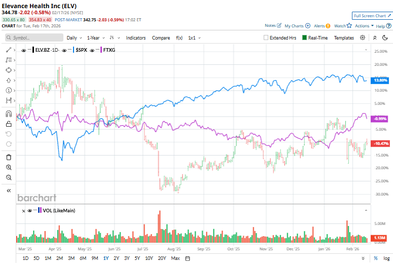 Elevance Health’s stock has struggled to keep pace with both the broader market and its healthcare peers. ELV stock has declined 11.4% over the past 52 weeks and 1.7% on a YTD basis. In comparison, the S&P 500 Index ($SPX) has returned 11.9% over the past year and declined marginally in 2026.
