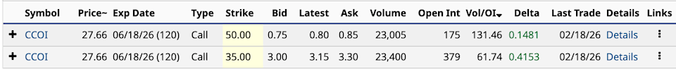 That’s where its unusual options activity comes in. CCOI had two call options with Vol/OI (volume-to-open-interest) ratios in the top 10.