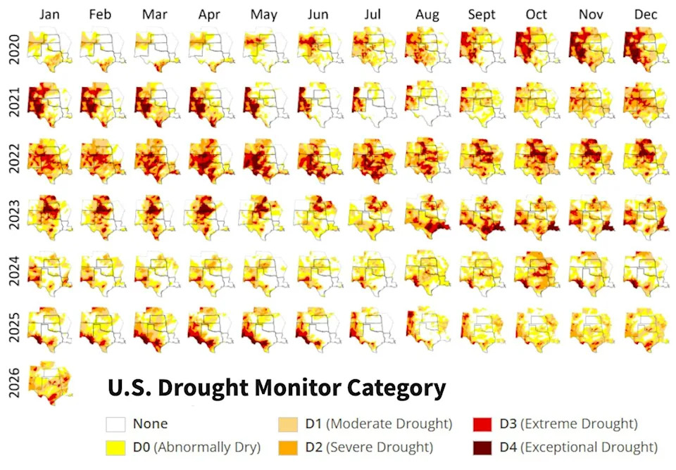 Cattle auctions aren’t often all-night affairs. But in Texas Lake Country in June 2022, ranchers facing dwindling water supplies and dried out pastures amid a worsening drought sold off more than 4,000 animals in an auction that lasted nearly 24 hours – about 200 cows an hour. It was the height of a drought that has gripped the Southern Plains for the past six years – a drought that is still holding on in much of the region in 2026. The drought cost the agriculture industry across Kansas, Oklahoma and Texas an estimated US$23.6 billion in lost crops, higher feed costs and selling off cattle from 2020 through 2024 alone. As rangeland dried out, it has also fueled wildfires, including several in Texas in early 2026. Historically, droughts of this magnitude happen in the Southern Plains about once a decade, but the severe droughts of this century have been lasting longer, leaving water supplies, native rangelands and farms with little time to recover before the next one hits. Many cattle producers and rangelands were still recovering from a severe 2010-2015 drought when a flash drought hit western Texas in spring 2020, marking the beginning of the current multibillion-dollar, multiyear and multistate drought. Ample spring rainfall in 2025 and severe flooding in central Texas that year weren’t enough to end the drought, and a powerful winter storm in late January 2026 missed the driest parts of the region. In a recent study with colleagues at the Southern Regional Climate Center and the National Integrated Drought Information System, we assessed the causes and damage from the ongoing drought in the Southern Plains. We found three key reasons for the enduring drought and its damage: rising temperatures and a La Niña climate pattern; water supply shortages; and lingering economic impacts from the previous drought. The Southern Plains is known to be a hot spot for rapid drought development, and the ongoing drought that started in 2020 is no exception. Documented “flash droughts” – defined as periods of rapid drought onset or intensification of existing droughts – occurred at least five times in the region from 2020 to 2025. As global temperatures rise and climates warm, research warns that the frequency and severity of flash drought events will increase. For the southern part of the Southern Plains, winter precipitation is closely linked to the El Niño–Southern Oscillation, a climate pattern that affects weather around the world. Five of the past six years exhibited a La Niña pattern, which typically means the region sees winters that are warmer and drier than normal. La Niña was likely the primary driver – although not the only driver – of the drought for Texas and southwest Oklahoma, and one of the reasons drought conditions have continued into 2026. The Southern Plains have a long history with severe droughts. The Dust Bowl of the early 1930s may be the best-known example. But a history with drought doesn’t make it any easier to manage when crops and water supplies dry up. The heat and dryness since 2020 have left many of the region’s rivers, reservoirs and even groundwater reserves well below average. San Antonio’s reservoirs all reached record-low levels in 2024 and 2025, as did the Edwards Aquifer, which provides water for roughly 2.5 million people. They were still low as 2026 began. Surface water and groundwater resources across central and western Texas have been depleted to the point that even a few big storms can’t replenish them. A few major rivers flow into the Southern Plains from other drought-affected regions. Consider the Rio Grande, which begins in Colorado and winds through New Mexico and along Texas’ southern border: Not only has the Lower Rio Grande valley in southern Texas missed out on needed precipitation this winter, so did the Rio Grande headwaters in southern Colorado. Colorado is facing a snow drought in winter 2026, as is much of the western U.S. If it continues, there will be less snowmelt come summer to feed rivers, such as the Rio Grande, or fill reservoirs. In early February, the Elephant Butte, Amistad and Falcon reservoirs, along the Rio Grande, were only 11%, 34%, and 20% full, respectively. Like water supplies, the economy doesn’t just recover when the rains return. One of the reasons the current drought has been so costly is that parts of the region had not fully recovered from the 2010-2015 drought when the latest one began in 2020. With only a five-year break between droughts, the landscape behaved like someone with an already weakened immune system who caught a cold. During the 2010-2015 drought, cattle producers in Texas sold off about 20% of the statewide herd as water became scarce and rangeland dried up. Rebuilding a herd after a drought is a slow process. Pasture recovery can take a year or more, and a newborn heifer will take two years to mature and produce her own first calf. Cattle herds had still not returned to pre-2010 levels when the 2022 drought peak forced another mass sell-off. From 2020 through 2024, Texas’s herd size declined from 13.1 million to 12 million; Oklahoma’s declined from 5.3 million to 4.7 million; and Kansas’ declined from 6.5 million to 6.15 million. Looking beyond livestock, a large percentage of the Southern Plains’ crops failed in 2022, the peak year of the drought. In Texas, 25% of the corn crop was planted but never harvested, and 45% of the soybean crop was similarly abandoned. A normal season would have yielded a $2.4 billion cotton crop in Texas, but 74% of that crop was abandoned, slashing its value to roughly $640 million. Is the end in sight? With La Niña fading in early 2026 and its opposite, El Niño, potentially on the horizon, there’s a chance for wetter conditions that could reduce the drought in the fall and winter months of 2026. But the Southern Plains still have to get through spring and summer first. Ending a drought like this requires consistent precipit