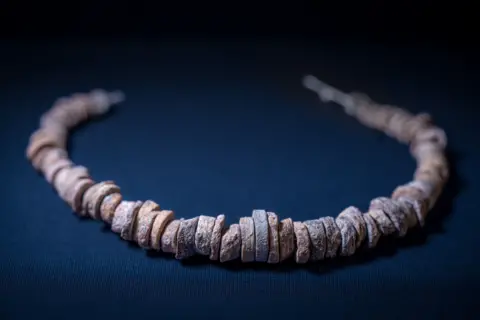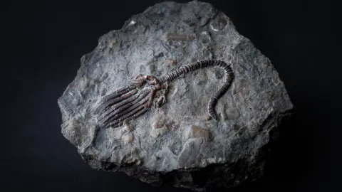 Christine Clark, 64, was hunting for fossils during a Boxing Day walk on Holy Island, Northumberland when something caught her eye. A tiny pebble seemed to be "smiling at me", she said. "It looked like someone's fake teeth." She took it home and posted it to a Facebook fossil identification page. Thousands of likes and comments later, others seemed to confirm her suspicion that it was, in fact, an ancient marine animal. Christine holidays every year to Northumberland with her husband Gerard where, she said, they regularly go hunting for Cuddy's beads on the Holy Island. A spit of land with only 150 residents and cut off twice daily by the sea, it is considered the cradle of early English Christianity. The "beads" are fossilised parts of the stem of a marine animal called a crinoid, but they earnt their nickname from St Cuthbert, considered the patron saint of the North of England. "He arrived on the island in 670s as a monk coming to the priory, he [was] buried here and miracles took place around his shrine," said Dr Frances McIntosh, collections curator in the North East at English Heritage. Hundreds of years later in the 1300s people were finding these small fossils. "But they didn't know what they were, they [thought] Cuthbert was making them and it was part of his spiritual process, and by collecting them they could become more spiritual," she said. And so the tradition has continued and on Boxing Day last year, Clarke was hunting for the beads, but she spotted an altogether very different looking fossil amongst the pebbles on the beach. "I saw this fossil smiling at me - it's the first set of teeth I have found", she joked. The BBC has had the fossil identified by the British Geological Survey (BGS) which confirmed it is a larger part of a crinoid. Crinoids are marine animals that first appeared in the Cambrian period, more than 500 million years ago, making it one of the oldest complex animals on the planet, and versions of it still exist today. It has a flexible stem, which is attached to the sea floor, with branching arms arranged around the main body of the animal at the top of the stem - although it is an animal, this arrangement has earnt them the nickname "sea lilies". "The stem consists of these little discs, called ossicles, and what Christine has found is a number of these ossicles connected together, in what is called a columnal," explained Dr Jan Hennissen, senior paleontologist at the British Geological Survey (BGS). The stem has been split lengthways and been curved round so that it resembles the very unusual "mouth-like" shape. "It is probably from a rock formation called the Alston formation, which is a dark limestone, and that is about 350 million years old," said Dr Hennissen. Crinoids are part of the phylum Echinodermata which also boasts sea urchins and sea cucumbers. It is very rare to find a complete crinoid, but rather the individual discs that make up the stem - these are the St Cuthbert's beads - and often resemble polo mints. Crinoid fossils are among the most common found on the Northumberland coast. Dr Hennissen said you can usually tell quite easily if you have found one there. "The biological form is very different from the surrounding rock normally - either a different colour or a different composition," he said. "And you can see these very strict lines, which are very defined as opposed to the [surrounding] mudstone." You can also get your fossil identified by sending pictures to the British Geological Survey or the Natural History Museum id unit. Christine has received offers to buy her fossil, but for the time being intends to keep it. "It brings a lot of amusement to many people," she said. Get our flagship newsletter with all the headlines you need to start the day. Sign up here. A researcher has named a newly-identified species in honour of his "inspirational" former teacher. Lyme Regis Museum has been given designated status by Arts Council England. Prof John Marshall has made 19 expeditions to Greenland and Norway over 30 years. The only dinosaur fossils to have been found on the island of Ireland will be on display in Cork for the next six months. Ireland is an unlikely candidate for dinosaur fossils but two were found on Islandmagee beach, two decades apart.