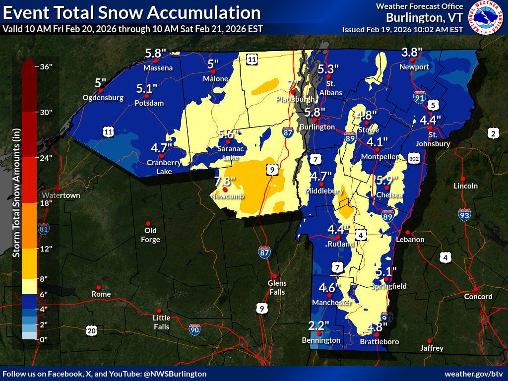 More snow is predicted for Friday, Feb. 20, 2026, with a winter storm watch issued for the southern Greens in Vermont, according to the National Weather Service branch in Burlington, VT.