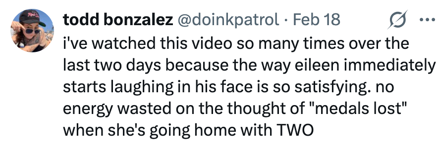 "I'm the most decorated female freeskier in history, I think that's an answer in and of itself." You got to give lots of credit to Eileen Gu for responding brilliantly back to the reporter with great confidence. She looked him in the eye said that was a "ridiculous perspective" without any hesitation or fear. π pic.twitter.com/fPz5uQIosT