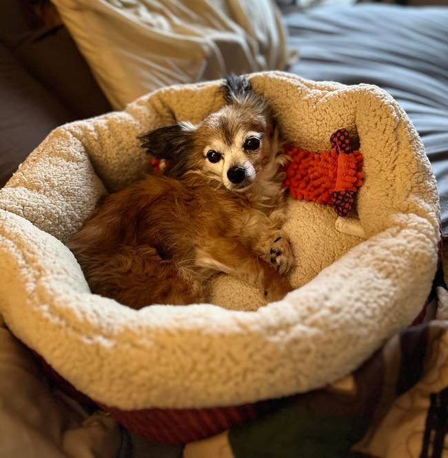 Promising review: "I was concerned that my senior pooch, who sleeps in the corner of my bedroom, wasn’t warm enough on cold nights (I turn down the heat) even though his old bed had several layers of blankets and a pillow. So this one seemed ideal ... I put this one inside his old bed (a hand-me-down from a larger dog), and he took to it immediately! It’s the perfect size for him (a beagle/Corgi cross, maybe), and he looks very happy all snuggled up in it." —Karen Templeton