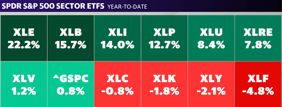 Investors have shifted their appetite from tech and megacaps into sectors that have been playing “catch-up” and benefiting from AI-fueled investments. Stocks broke a two-week losing streak on Friday, but year to date, Tech (XLK) and Consumer Discretionary (XLY), along with Financials (XLF), remain negative. "Money's coming out of this big behemoth. Money's moving out of tech," Truist chief investment officer and chief market strategist Keith Lerner told Yahoo Finance. Lerner noted the rotation away from Magnificent Seven giants like Microsoft (MSFT), e-commerce and cloud leader Amazon (AMZN), and EV maker Tesla (TSLA). Meanwhile, sectors that underperformed last year have been making big gains. Energy stocks (XLE) are up 22% since the start of the year. Rising oil prices and continued demand for oil have sent shares of Chevron (CVX) and ExxonMobil (XOM) up 20% and 22%, respectively. Materials (XLB) and Industrial stocks (XLI) are also up 15% and 14% as AI infrastructure buildouts and reshoring accelerate. Meanwhile, investors have turned to defensive areas of the market like Consumer Staples (XLP), with consumer giant Walmart (WMT) hitting an all-time high earlier this month. Although portfolio rebalancing — where investors shift from overvalued sectors into more stable areas — typically happens at the start of the year, this year’s rotation has been amplified by volatility. A sell-off in pockets of the tech sector began last month amid fears that artificial intelligence could take over tasks traditionally handled by enterprise software companies. The Tech-Software Sector ETF (IGV) is down 23% year to date. The "AI scare trade" has now spread from software to wealth management and logistics. Cybersecurity firms were the latest to get hit on Friday after Anthropic announced a new security tool. Shares of CrowdStrike (CRWD) dropped 5%, while Zscaler (ZS) and Cloudflare (NET) also fell 4% and 6%, respectively. “Everyone's kind of going through each one, sector by sector, industry by industry, trying to figure out where the AI disruption is going to be beyond just within tech itself,” Lerner said. Profit growth and the easing of interest rates by the Federal Reserve should help the stock market continue to broaden. Polymarket betters are predicting two to three rate cuts in 2026. (Disclosure: Yahoo Finance has a partnership with Polymarket.) "With the easing cycle still intact, and the US economy showing resilience ... we expect healthy and broadening profit growth across sectors," UBS strategists said on Thursday. The firm predicts that the broader index S&P 500 (^GSPC) could reach 7,700 by year-end. "We see attractive opportunities across financials, health care, utilities, consumer discretionary, and industrials," the strategists added. Ines Ferre is a senior business reporter for Yahoo Finance. Follow her on X at @ines_ferre. Click here for in-depth analysis of the latest stock market news and events moving stock prices Read the latest financial and business news from Yahoo Finance
