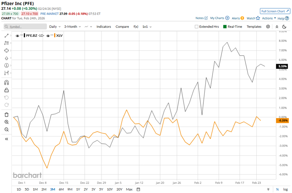 With a market cap of $154.3 billion, Pfizer Inc. (PFE) is a global biopharmaceutical company that discovers, develops, manufactures, and markets medicines and vaccines across a wide range of therapeutic areas in the United States and internationally. It also engages in contract manufacturing and strategic collaborations with partners including Bristol-Myers Squibb, Astellas, BioNTech, and Boltz, PBC to advance innovative drug development. Companies valued more than $10 billion are generally classified as “large-cap” stocks, and Pfizer fits this criterion perfectly. Its portfolio spans cardiovascular disease, infectious diseases, immunology, oncology, rare diseases, and COVID-19 prevention and treatment, with well-known brands such as Eliquis, Prevnar, Comirnaty, Paxlovid, and Ibrance. Micron Stock Trades Near Record High — Cash Out or Hold On? Microsoft Stock Just Flashed an Ultra-Rare Bullish Signal for Options Traders Western Digital Is Selling Sandisk Stock. Should You? Markets move fast. Keep up by reading our FREE midday Barchart Brief newsletter for exclusive charts, analysis, and headlines. Shares of the New York-based company have decreased 2.9% from its 52-week high of $27.94. PFE stock has increased 7.6% over the past three months, exceeding the State Street Health Care Select Sector SPDR ETF’s (XLV) 1.7% gain over the same time frame. In addition, PFE stock is up 9% on a YTD basis, outperforming XLV’s 2% rise. However, longer term, shares of the company have risen 1.8% over the past 52 weeks, lagging behind XLV’s 6.9% return over the same time frame. The stock has been trading above its 50-day and 200-day moving averages since October 2025. Shares of Pfizer fell 3.3% on Feb. 3 after the company reaffirmed 2026 guidance, pointing to a revenue decline, driven by a ~$1.5 billion hit from patent cliffs and ongoing pressure from waning COVID-19 product sales. Pfizer forecast 2026 revenue of $59.5 billion - $62.5 billion and adjusted EPS of $2.80 - $3, down from $62.6 billion revenue and $3.22 adjusted EPS in 2025, also factoring in tariff impacts and only ~$5B expected from COVID-19 products. Despite reporting better-than-expected Q4 2025 revenue of $17.6 billion and EPS of $0.66, investors focused on the outlook as Paxlovid and Comirnaty sales fell ~70% and ~35% year-over-year, reinforcing concerns. In comparison, rival Amgen Inc. (AMGN) has outpaced PFE stock. AMGN stock has returned 17% on a YTD basis and 23.6% over the past 52 weeks. Due to the stock’s underperformance over the past year, analysts remain cautious about its prospects. PFE stock has a consensus rating of “Hold” from 27 analysts in coverage, and the mean price target of $28.58 is a premium of 5.3% to current levels. On the date of publication, Sohini Mondal did not have (either directly or indirectly) positions in any of the securities mentioned in this article. All information and data in this article is solely for informational purposes. This article was originally published on Barchart.com