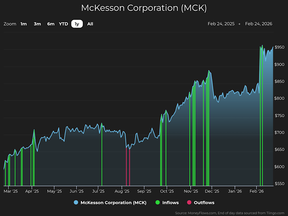 MCK is the nation’s largest pharmaceutical distributor to hospitals, retail pharmacies, and medical offices, operating through four business lines: U.S. pharmaceutical, prescription technology solutions, medical-surgical solutions, and international. In its third-quarter fiscal 2026 earnings report, MCK showed $106.2 billion in revenue (an 11% gain), an operating profit of $1.7 billion (a 13% year-over-year rise), and adjusted per-share earnings guidance of up to $39.20 (a 19% gain). It’s no wonder MCK shares are up 17% so far this year – and they could rise more. MoneyFlows data shows how Big Money investors are again betting heavily on the stock. Institutional volumes reveal plenty. In the last year, MCK has enjoyed strong investor demand, which we believe to be institutional support. Each green bar signals unusually large volumes in MCK shares. They reflect our proprietary inflow signal, pushing the stock higher: Plenty of health care names are under accumulation right now. But there’s a powerful fundamental story happening with McKesson. Institutional support and a healthy fundamental backdrop make this company worth investigating. As you can see, MCK has had strong sales and earnings growth: 3-year sales growth rate (+10.9%) 3-year EPS growth rate (+83%) Source: FactSet Also, EPS is estimated to ramp higher this year by +13.4%. Now it makes sense why the stock has been generating Big Money interest. MCK has a track record of strong financial performance. Marrying great fundamentals with MoneyFlows software has found some big winning stocks over the long term. McKesson has been a top-rated stock at MoneyFlows for years. That means the stock has unusual buy pressure and growing fundamentals. We have a ranking process that showcases stocks like this on a weekly basis. It’s drawn nine outlier inflow signals in the last year, gaining 58% in that time. The blue bars below show when MCK was a top pick on the Outlier 20 report in the last year…Big Money loves it: Tracking unusual volumes reveals the power of money flows. This is a trait that most outlier stocks exhibit…the best of the best. Big Money demand drives stocks upward. The MCK action isn’t new at all. Big Money buying in the shares is signaling to take notice. Given the historical gains in share price and strong fundamentals, this stock could be worth a spot in a diversified portfolio. Disclosure: the author holds no position in MCK at the time of publication. If you are a Registered Investment Advisor (RIA) or are a serious investor, take your investing to the next level and follow our free weekly MoneyFlows insights. This article was originally posted on FX Empire Sterling Declines as the BoE Appears More Dovish See How Huge Inflow Signals Power Vita Coco Gains See DHT Holdings Rise with Institutional Inflows Can Lagarde Push the EUR/USD Higher? (Part 2) Strength for the Dollar Ahead of GDP Inflows Push Chip Supplier Rambus to New Heights