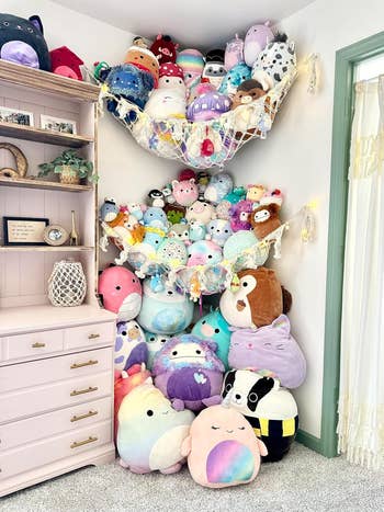 Promising review: "SO cute, SO high quality. My partner and I own a lot of stuffed animals. They were taking over the entire house. Stuffies EVERYWHERE! I was not expecting this to be so beautiful and sturdy in person, and I couldn’t be happier! I love that it came with a string light and star stickers, too. Absolutely precious. I don’t have kids, but I’m a kid at heart, and this was everything I could hope for! It saves us so much room, and it looks so nice! It’s high-quality, thick material. I love that it comes in my favorite shade of gray, and it holds a stupendous amount of plushies with no issues." —Skye
