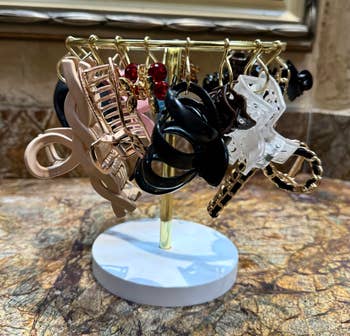 Promising review: "Very elegant stand that holds all of my hair claws (and then some) very easily. Material is light but sturdy, and looks great on my dresser. It freed up so much room, and makes it easy to access all of my claws at a whim. I even opened one of the hooks to hold my hair ties, so all my accessories fit on one device! I would love if the base could rotate, but that’s a minor inconvenience (and something I might DIY in the future). Overall, love the value for the product, and I highly recommend especially if you have a variety of sizes of hair claws."—Monique G.