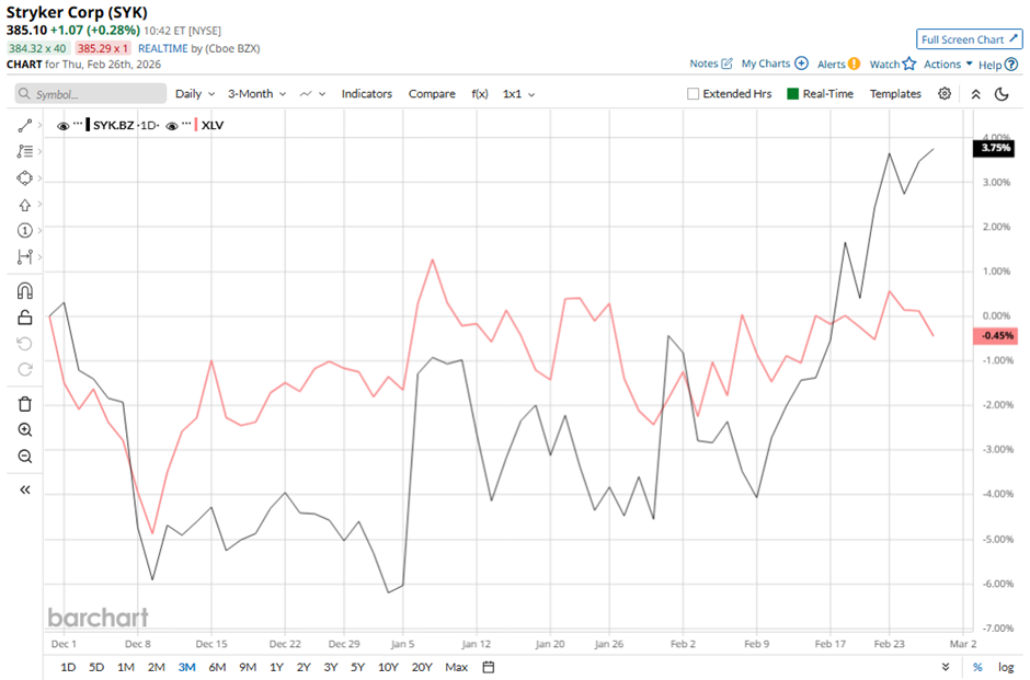 With a market cap of around $147 billion, Stryker Corporation (SYK) is a global medical technology company that develops and markets innovative products for use by doctors, hospitals, and healthcare facilities across approximately 61 countries. It operates primarily through its MedSurg and Neurotechnology, and Orthopaedics segments, offering solutions ranging from surgical equipment and AI-assisted virtual care to stroke treatment and patient safety technologies. Companies valued at $10 billion or more are generally considered “large-cap” stocks, and Stryker fits this criterion perfectly. Its Orthopaedics portfolio includes advanced implants for joint replacement and trauma surgeries, along with robotic-assisted systems such as Mako Shoulder that expand its smart robotics platform. 3 Highest Rated Dividend Kings for Generations of Income As Nvidia Launches New AI Laptop Chips, Should You Buy NVDA Stock? GE Aerospace Is Linking Up with Palantir. Should You Buy GE Stock Here? Get exclusive insights with the FREE Barchart Brief newsletter. Subscribe now for quick, incisive midday market analysis you won't find anywhere else. Shares of the medical device maker have declined 4.6% from its 52-week high of $404.87. Over the past three months, Stryker's shares have gained 3.8%, outperforming the State Street Health Care Select Sector SPDR ETF’s (XLV) marginal decrease during the same period. SYK stock has increased 9.9% on a YTD basis, outpacing XLV’s 1.8% gain. However, in the longer term, shares of Stryker have decreased 1.4% over the past 52 weeks, lagging behind XLV’s 6.6% rise during the same period. Despite recent fluctuations, the stock has been trading below its 50-day and 200-day moving averages since September 2025. Shares of Stryker rose 4.3% following its Q4 2025 results on Jan. 29 as the company delivered strong double-digit operating performance, with reported net sales up 11.4% to $7.2 billion, organic growth of 11%, and adjusted EPS rising 11.5% to $4.47, all exceeding market expectations. Investor sentiment was further boosted by meaningful margin expansion, as adjusted operating margin increased 100 basis points to 30.2%, reflecting operating leverage and disciplined cost control alongside robust demand in MedSurg and Neurotechnology, which grew 17.5% year over year. In comparison, its rival Becton, Dickinson and Company (BDX) has outpaced SYK stock. BDX stock has dropped marginally over the past 52 weeks and soared 17.2% on a YTD basis. Despite the stock’s underperformance relative to its peers over the past year, analysts are moderately optimistic about Stryker. The stock has a consensus “Moderate Buy” rating overall from the 28 analysts covering the stock, and the mean price target of $429.37 represents a premium of 11.6% to current levels. On the date of publication, Sohini Mondal did not have (either directly or indirectly) positions in any of the securities mentioned in this article. All information and data in this article is solely for informational purposes. This article was originally published on Barchart.com
