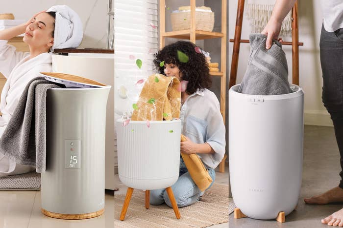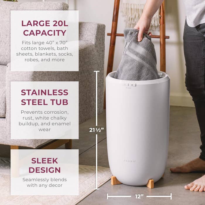 How fun is this midcentury modern-looking warmer with its three wooden legs? It has a 12-liter capacity that can fit one large towel, if you don't want something so giant taking up space in your bathroom, and the auto-shutoff timer can go all the way up to 90 minutes. This warmer also includes scent discs for aromatherapy, to add a lovely fragrance to your towels that'll make wrapping yourself in them that much nicer.