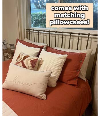 Promising review: "Love this duvet cover. It looks way more expensive than it is. The buttons add a nice bit of flair and are made from wood — or at least seem like it, ha ha. The orange color is a subdued burnt orange, not too saturated and bright. It does wrinkle a little, but not as badly as expected, considering it is linen bedding. We get lots of compliments on it. It is also a perfect weight — not so thin that I feel like I will rip it, which is what I was worried about due to the price. This is a great set. Go for it." —Pepper
