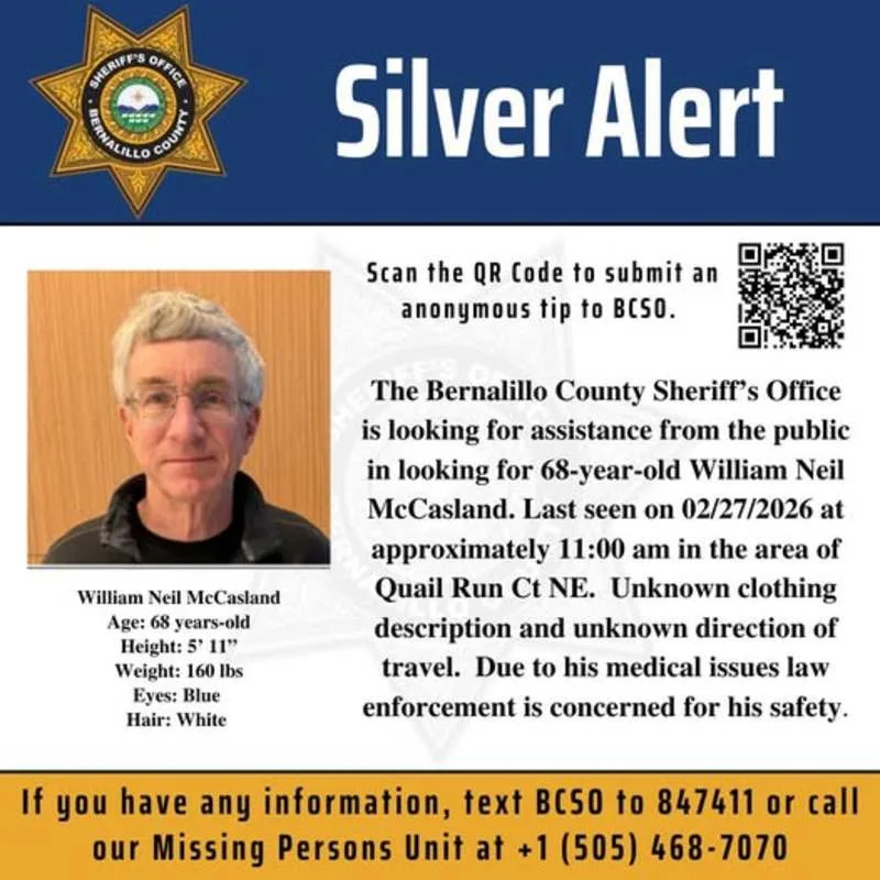 The Bernalillo County Sheriff's Office posted a missing person's photo of McCasland on Facebook, writing, "Due to his medical issues, law enforcement is concerned for his safety." He was last seen at 11 a.m. His clothing and direction of travel were unknown.