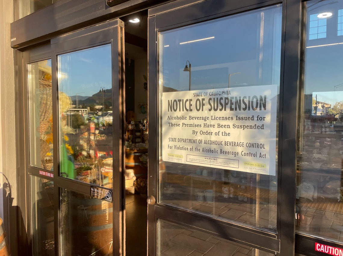 According to a notice posted on the door of the store, SLO Ranch Market’s alcoholic beverage license from the State Department of Alcoholic Beverage Control was suspended for 15 days starting Feb. 26.