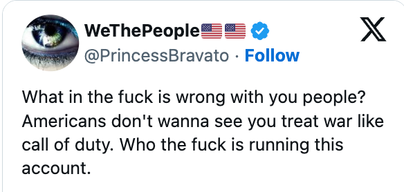 "US troops are dying in a war and the White House is out here treating it like it's a video game. The bar is in hell."