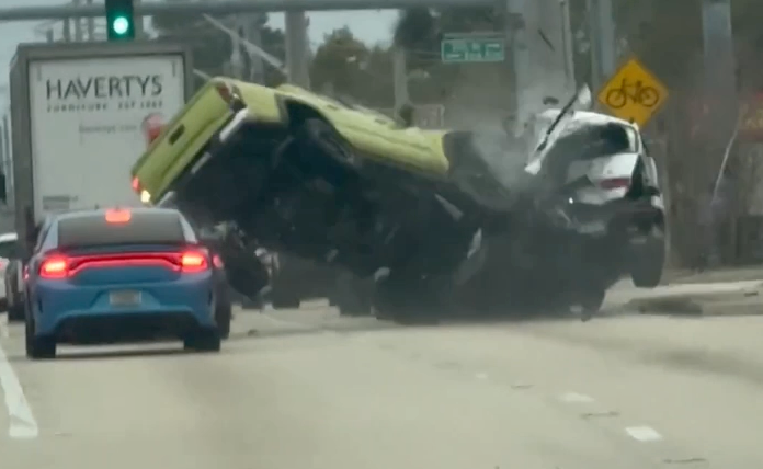 The dramatic footage shows the green pickup overtaking McDonald and rapidly catching up with vehicles stopped a little farther ahead. The driver “was accelerating the entire time until a last-second brake attempt,” McDonald said, with the video capturing the powerful impact which sent the truck flying.