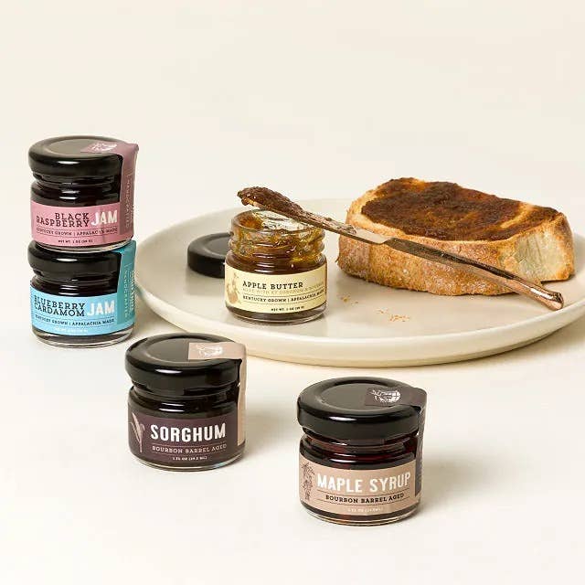 This set includes apple butter spread, black raspberry jam, blueberry bourbon cardamom jam, bourbon barrel aged maple syrup, and bourbon barrel aged sorghum.