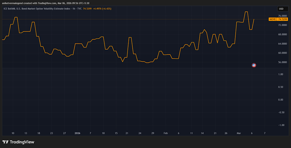 Benzinga and Yahoo Finance LLC may earn commission or revenue on some items through the links below. Arthur Hayes, Chief Investment Officer at Maelstrom Fund, told Benzinga on Thursday that rising oil prices and treasury yields could prove positive for Bitcoin. Hayes pointed out the surge in yields on the 10-year Treasury note, which is not typical in a “risk-off” scenario. The yield on the supposedly low-risk investment, for context, climbed to a 3-week high of 4.143% as the Middle East war pushed oil prices higher while dragging down stocks and cryptocurrencies. Hayes argued that the surge in oil prices has disrupted “normal investor behavior.” The BitMEX founder further noted that as the 10-year Treasury price falls, the MOVE Index, which tracks the volatility in the U.S. Treasury bond market, rises. Don't Miss: The AI Marketing Platform Backed by Insiders from Google, Meta, and Amazon — Invest at $0.85/Share This ETF issuer isn't chasing the index — it's building tools for income, leverage, and conviction “Historically, over the past 5 years, if the MOVE index is >130, there is likely some sort of monetary bailout rolled out by the U.S. Government,” Hayes said. As of this writing, the index stood at 74.52. Source: TradingView He contended that elevated yields would continue to drive volatility higher, leading to increased money printing. “And then the money printing will begin in some way, shape or form, which benefits Bitcoin,” he added. Trending: Build your own AI-powered index in minutes — and earn an uncapped 1% match when you move your portfolio to Public. Learn how it works. Hayes’ observations come amid the escalating Middle East tensions. Earlier this week, he warned that prolonged U.S. military engagement could force the Federal Reserve to increase money printing to finance the war, ultimately pushing Bitcoin prices upward. Hayes has consistently stressed the importance of fiat liquidity growth, advising traders to consider the expectations and realities of money printing when setting targets for Bitcoin. He also reiterated his $250,000 Bitcoin target for 2026 and projected $500,000 to $750,000 by the end of 2027. Photo Courtesy: Hi my name is Jacco on Shutterstock.com Read Next: Get Matched With a Fiduciary Advisor for a Complimentary 1-on-1 Strategy Session Motley Fool's analysts have built a new lineup of passive ETFs — explore which "Foolish" strategy fits your investment goals. Building a resilient portfolio means thinking beyond a single asset or market trend. Economic cycles shift, sectors rise and fall, and no one investment performs well in every environment. That's why many investors look to diversify with platforms that provide access to real estate, fixed-income opportunities, professional financial guidance, precious metals, and even self-directed retirement accounts. By spreading exposure across multiple asset classes, it becomes easier to manage risk, capture steady returns, and create long-term wealth that isn't tied to the fortunes of just one company or industry. Rad AI's award-winning artificial intelligence technology helps transform data chaos into actionable insights, enabling the creation of high-performing content with measurable ROI. Their Regulation A+ offering allows investors to participate at $0.85 per share with a minimum investment of $1,000, providing an opportunity to diversify portfolios into early-stage AI innovation. For investors seeking exposure to the rapidly growing AI and tech sector, Rad AI offers a chance to get in on the ground floor of a data-driven growth story. Paladin Power is addressing the growing demand for energy independence with a fire-safe energy storage system that doesn't rely on lithium-ion batteries. Instead, its ESS uses non-lithium, solid-state graphene battery technology designed for durability, safety, and long service life—positioning it as an alternative to fire-prone storage solutions that dominate today's market. Since launching in 2023, Paladin has generated $185 million in contracted revenue, achieved strong year-over-year growth, and secured a manufacturing agreement with NYSE-listed Jabil. With systems already deployed across residential and commercial properties and a $500B global electrification market opportunity ahead, Paladin offers investors exposure to decentralized energy infrastructure backed by real contracts, U.S.-based manufacturing, and scalable next-generation technology. Elf Labs is an IP-focused entertainment company built on a strategy that has powered giants like Disney and Marvel: ownership of globally recognized character IP. After more than a decade of rights acquisition, the company controls 500+ protected trademarks and copyrights tied to iconic characters including Cinderella, Snow White, Rapunzel, Sleeping Beauty, and Peter Pan. This foundation has generated over $15 million in royalties, expanded licensing into 30+ countries, and supported development of 100+ product lines. With its Nasdaq ticker ($ELFS) reserved and valuation growth exceeding 1,600% in under two years, Elf Labs is now scaling distribution through patented production systems, global licensing, and streaming and mobile initiatives—offering investors exposure to a private entertainment company with a clear public-market trajectory. Valley Center Wellness is setting a new benchmark in luxury behavioral health with its flagship facility in Corona, California. Designed as a private, resort-style wellness retreat on a 4.2-acre estate, the center combines discretion, comfort, and comprehensive care, offering patients private chefs, daily massages, acupuncturist sessions, and access to a pool, spa, gym, and basketball court. Focused on high-profile and affluent clients, Valley Wellness provides fully customized treatment plans outside the constraints of insurance, emphasizing long-term recovery, holistic wellness, and life-after-addiction strategies. Through its three-stage care model—incl