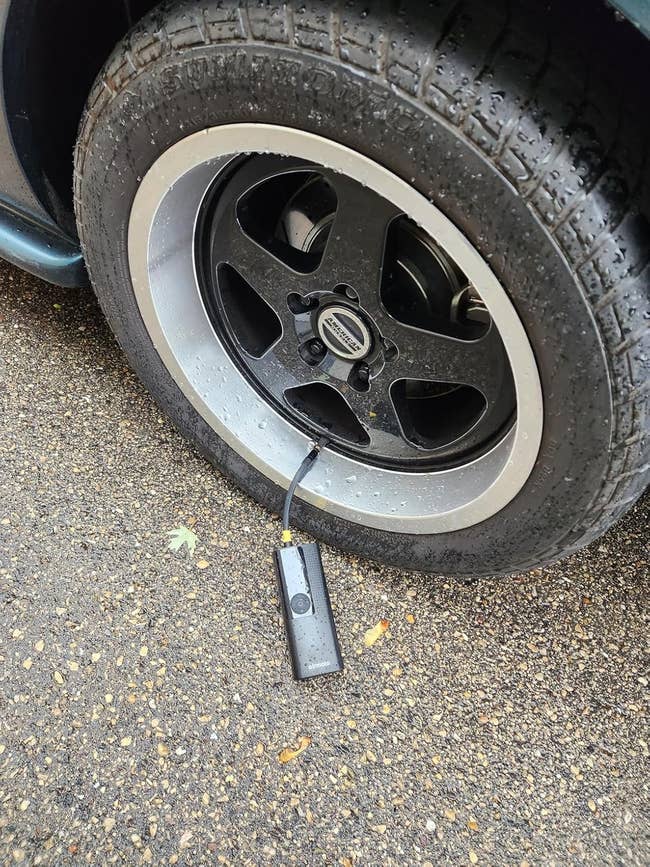 Promising review: "I was able to inflate all my tires in less than 10 minutes using the Airmoto tire inflator. Of course, it depends on how low your tires are, but it worked quickly for me. It does make a sound when turned on, but it’s not loud in my opinion. It’s easy to charge, and I really like that it comes with different head accessories, which makes it versatile. I used this on my 2012 Chevrolet and had no issues at all. Overall, very convenient and worth it!" —Rodrigo