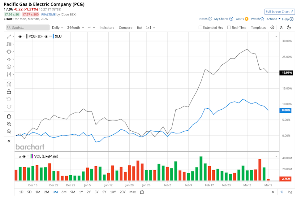 Valued at a market cap of $40 billion, PG&E Corporation (PCG) is an Oakland, California-based company that sells and delivers electricity and natural gas. Companies worth $10 billion or more are typically classified as “large-cap stocks,” and PCG fits the label perfectly, with its market cap exceeding this threshold, underscoring its size, influence, and dominance within the utilities - regulated electric industry. The company has shifted towards aggressive grid modernization and climate resilience, specifically through its industry-leading "undergrounding" program and the integration of "Distributed Intelligence" to manage one of the nation's most complex renewable energy grids. ‘When You See One Cockroach, There are Probably More’: Blackrock Forced to Halt Redemptions As $2 Trillion Private Lending Bubble Starts Showing Cracks Analysts Say These Are the Top 3 Stocks to Buy Amid the U.S.-Israel War on Iran Iran War, CPI and Other Key Thing to Watch this Week Our exclusive Barchart Brief newsletter is your FREE midday guide to what's moving stocks, sectors, and investor sentiment - delivered right when you need the info most. Subscribe today! This utility company is currently trading 5.5% below its 52-week high of $19.16, reached on Mar. 2. Shares of PCG have rallied 20.8% over the past three months, outpacing the State Street Utilities Select Sector SPDR ETF’s (XLU) 8.1% rise during the same time frame. Moreover, on a YTD basis, shares of PCG are up 12.7%, compared to XLU’s 8.3% return. However, in the longer term, PCG has gained 13.4% over the past 52 weeks, trailing behind XLU’s 19.6% uptick over the same time frame. To confirm its recent bullish trend, PCG has been trading above its 200-day and 50-day moving averages since early February. Shares of PCG surged 2.7% on Feb. 12, after delivering its Q4 results. The company announced its fourth reduction in residential bundled electric rates over the past two years, while natural gas rates also declined. In addition, its core EPS of $0.36 increased 16.1% year over year, matching analysts’ expectations. The company further strengthened investor sentiment by raising its fiscal 2026 core EPS guidance to a range of $1.64 to $1.66. PCG has outperformed its rival, Duke Energy Corporation (DUK), which gained 12.2% over the past 52 weeks and 11.7% on a YTD basis. Looking at PCG’s recent outperformance, analysts remain highly optimistic about its prospects. The stock has a consensus rating of "Strong Buy” from the 17 analysts covering it, and the mean price target of $22.32 suggests a 23% premium to its current price levels. On the date of publication, Neharika Jain did not have (either directly or indirectly) positions in any of the securities mentioned in this article. All information and data in this article is solely for informational purposes. This article was originally published on Barchart.com