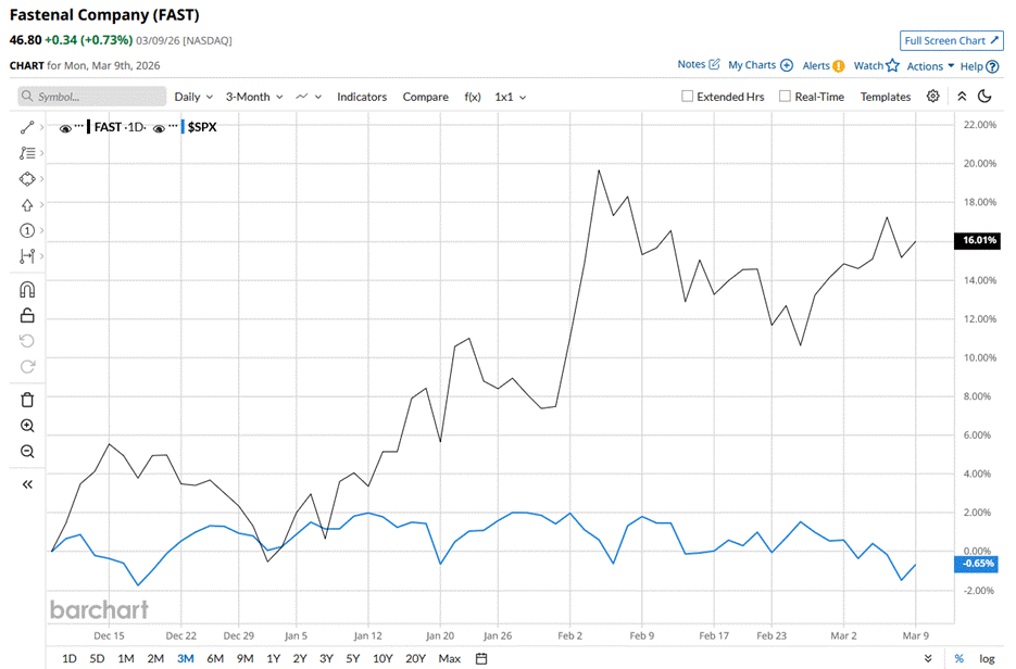 Winona, Minnesota-based Fastenal Company (FAST) engages in the wholesale distribution of industrial and construction supplies in the United States and internationally. Valued at a market capitalization of $53.7 billion, the company’s offerings include fasteners and related industrial and construction supplies under the Fastenal brand name. Companies with a market cap of $10 billion or more are typically referred to as “large-cap stocks.” Fastenal fits right into that category, with its market cap exceeding this threshold, reflecting its substantial size and influence in the industrial distribution industry. Dear Oracle Stock Fans, Mark Your Calendars for March 10 Stocks Close Higher After President Trump says Iran War is "Pretty Much" Complete As Elon Musk Aims for AGI, Should You Buy Tesla Stock Now? Stop Missing Market Moves: Get the FREE Barchart Brief – your midday dose of stock movers, trending sectors, and actionable trade ideas, delivered right to your inbox. Sign Up Now! FAST stock touched its 52-week high of $50.63 on Aug. 25, 2025, and is currently trading 7.6% below that peak. FAST has surged 16% over the past three months, outperforming the S&P 500 Index’s ($SPX) marginal decline during the same time frame. However, Fastenal’s shares have lagged behind the broader market over the longer term. The stock surged 17% over the past 52 weeks, while SPX delivered 17.8% returns over the same time frame. Momentum has turned bullish for Fastenal, with the stock holding above its 50-day and 200-day moving averages since January. On Jan. 21, FAST stock rose 4.7% following the release of its Q4 2025 earnings. The company’s net sales for the quarter grew 11.1% year over year (YoY) to $2 billion and matched the Street’s estimates, with the management citing improved customer contract signings since Q1 being the biggest driver of this growth. Moreover, the company’s adjusted EPS for the quarter amounted to $0.26, also matching Wall Street estimates. When stacked against its peer, W.W. Grainger, Inc. (GWW), FAST has outperformed. Over the past year, GWW stock has climbed 10.7%. Wall Street is taking a cautious stance on FAST. Among the 17 analysts covering the stock, the overall consensus sits at a “Hold.” After its recent rally, the shares already trade above the average price target of $45.69. Still, the most optimistic call on the Street is $52, suggesting about 11% upside potential if momentum continues. On the date of publication, Sristi Jayaswal did not have (either directly or indirectly) positions in any of the securities mentioned in this article. All information and data in this article is solely for informational purposes. This article was originally published on Barchart.com