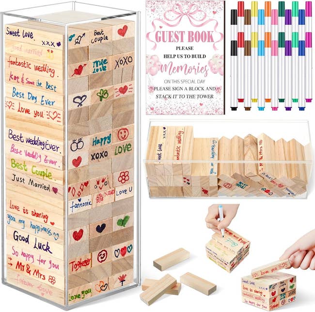 We hope you love our recommendations! While every product is independently chosen by our editors, BuzzFeed and our publishing partners may collect a share of sales or other compensation from the links on this page. You can read more about how our affiliate partnerships work in our Editorial Standards & Ethics Guide. You deserve a guest book that is as memorable as your special day. Let's be so for real — most wedding guest books get signed once, flipped through maaaybe twice, and then pretty much live out the rest of their days in a box next to your cute dress or on a shelf collecting dust. But what if I told you that there was a world of beautiful and unique guest book options that you'd love so much, you'd actually leave them out as a coffee table book or even play with them on game nights? If you love the idea of having sweet messages to look back on from your special day, and also want something that you'd be proud to leave out in your space, then buckle up. This list is full of fun, unique, and gorgeous wedding guest books that actually feel personal, meaningful, and worth keeping out for all who visit your house to see and admire. So, whether you’re looking for something personalized, non-traditional, or just more meaningful than a blank notebook, I've curated options on options on options you’ll treasure for years to come. This unique beauty is nowhere near your grandma’s boring guest book (no offense, grandma!). It’s like a storybook for your love story, with ornate fairytale design flourishes and typography that'll make this gem one of your most prized heirlooms. It includes 100 blank pages and is bound within the covers of your chosen customizable design. If you consider yourself a modern romantic, are always daydreaming about being a character on Bridgerton, or have considered yourself a Disney princess since birth, you'll love this display-worthy guest book. Get it from The Knot for $46.99 (available in six colors). And check out their other guest book options here. Say hello to the guest book that your people will not only love to use, but that you'll also get a huge kick out of looking back on long after your big day is over. Guests will get to use a rented retro rotary phone and leave an audio message that actually captures their voice, laughter, and personality. So now you’re not just scrolling signatures — you’re reliving moments in a way that paper could nevah provide. If you care about capturing how people felt that day and not just that they showed up, this is def the guest book to invest in. How it works: You just select which color option you'd like, and they'll ship out your phone to arrive before your event. And it has a simple one-button setup for the big day. Then, after everything is over, you return the phone with the included return label, and After The Tone will hand-edit your voicemails into forever keepsakes. You have a choice of getting a shareable digital audio file, a USB, and even a hand-cut vinyl record! Promising review: "SO happy we used After The Tone for our wedding! The guests had so much fun leaving voicemails. They processed the voicemails so quickly that we were able to listen to them on our honeymoon. They were hilarious, heartfelt, and so much fun. There was one voicemail that was cut off, but their team fixed it right away. They were responsive and professional." —Trina N. Get it in pink from After The Tone for $299 (available in 10 other colors). Ok, but can we talk about how stunning this embroidered beauty from Rifle Paper Co. will look not only at your wedding, but also on your coffee table for years afterwards?! It’s 144 half-lined and half-blank pages that are beautifully bound in between a bookcloth cover that's decked out in wildflowers and metallic gold accents, along with a delicate ribbon bookmark. With tons of room for notes, photos, and even little sketches, it'll give you the perfect wedding memory vault. Promising review: "This guest book is so lovely, the embroidery is even better in real life. My guests also liked it, and it is nice to be able to add pictures or other things to the blank pages." —Suvi H Get it from Rifle Paper Co. or Amazon for $52 (available in two options). And get the matching pen here or on Amazon. If you and your partner are huge gamers, then you'll love this fun guest book alternative — wooden stacking blocks! Guests can grab one of the 24 colorful pens (that come in 12 colors), jot down well wishes, jokes, or advice on the individual blocks, and then stack them to build a tower of love you’ll actually want to pull out on game night later on. It’s equal parts keepsake and party game, giving everyone a chance to contribute and have fun. Promising review: "The most unique 'guest book' for any event! I ordered this set, and it was a very interactive thing for guests to do. The markers are a nice paint style that really pops. We even loved the sign that came with it to tell people what exactly to do." —Ally Get it from Amazon for $31.99+ (available in 10 sign styles). If you're all about florals, personalization, and premium quality, this gorgeous guest book from Papier def checks all the boxes. The chic hardcover, arranged in the most dreamy arch shape, is customizable with the names of you and your boo, along with the wedding date. And the 96 luxuriously thick pages inside are just begging to be filled with heartfelt messages and warm well‑wishes. The classic yet modern design can fit many different wedding vibes, and the ribbon bookmark makes sure you never lose a favorite note. Promising review: “Exactly what I wanted and was looking for! The personalization of the notebook really makes me so happy. Worth every dollar” —Bruce Get it from Papier for $65. And check out the other options they have here. I don't know about y'all, but I was pretty blown away by how pricey some of these guest books can be. So, if you are thoughtfully counting your coins, but still want 