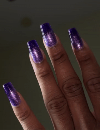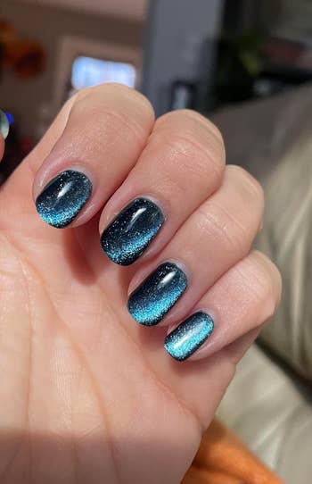 Promising review: "I've been doing my nails for years, and this was so fast and fun to use. I always wanted cat eye polishes in my collection and this was perfect! Especially for Christmas time! I will say they are thick, and I'm guessing that's because they're pigmented and packed with the little magnetic bits for maximum shine and glimmer. I feel like I have the northern lights on my nails! I would recommend playing on a few test nails beforehand to get a handle on the different patterns you can make with the magnet. Overall, would recommend it for anyone wanting something easy and fun!" —Hailey