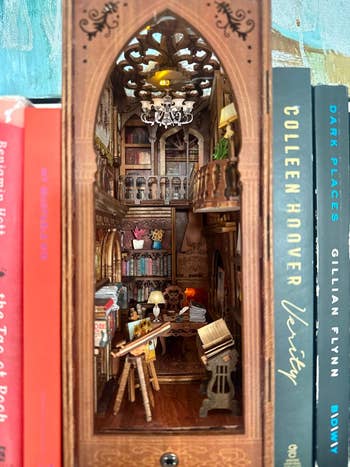 Promising review: "This book nook took me two days to make, and I am so in love with the final result. The instructions are very clear. Some pieces broke, so be sure to be patient while cutting them out. I glued the broken ones back together with no problem. This works with a motion sensor, but you can access the battery pack from the back, which is really convenient! The most tedious part of this is making the books, but after that, it goes pretty fast! The lights are amazing, and they tell you where to place them in the instructions. This was my first book nook I’ve ever built! I will definitely be buying more in the future!" —Phoenix