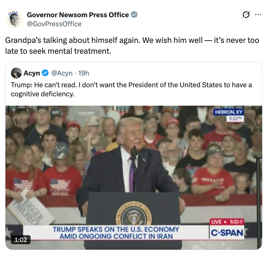 Trump: Newsom had admitted he has mental problems, that he's not a smart person, that he’s unable to read a speech. He can't read. I don't want the president of the United States to have a cognitive deficiency. pic.twitter.com/TadARABxPX