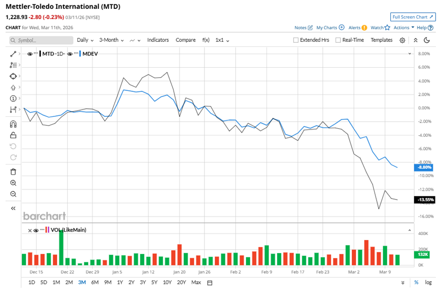 Despite its notable strength, MTD slipped 19.4% from its 52-week high of $1,525.17, achieved on Nov. 25, 2025. Over the past three months, MTD stock fell 13.6%, underperforming the First Trust Indxx Global Medical Devices ETF’s (MDEV) 8.8% decline during the same time frame.