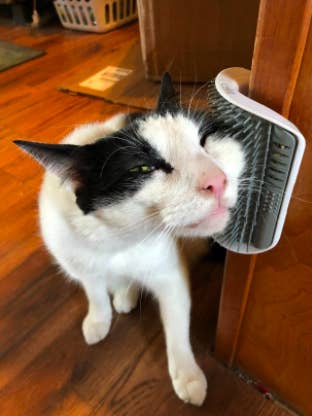 THE SOLUTION: Mount a simple cat-grooming brush to help your kitty get some rubs when your hands are all tied up with other tasks.