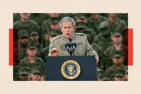 Three weeks on from the statue coming down, America's President, George W Bush, stood aboard a US aircraft carrier, anchored off the Californian coast, behind a banner saying "Mission Accomplished". Except it was anything but.