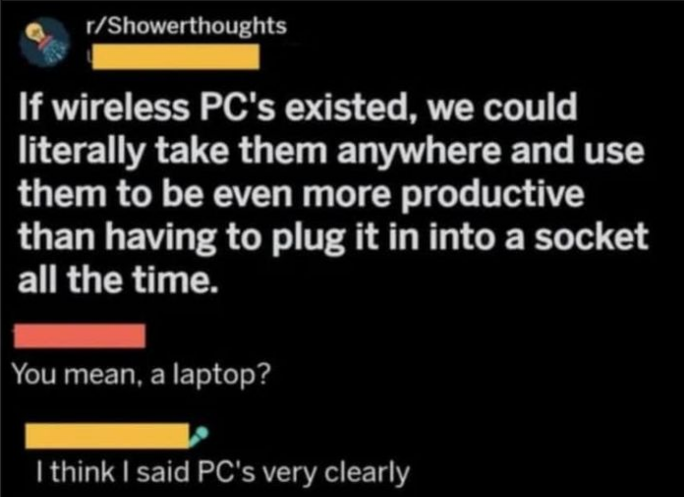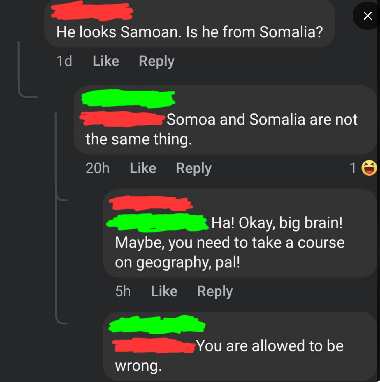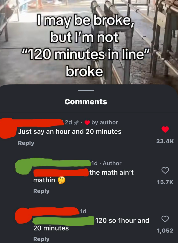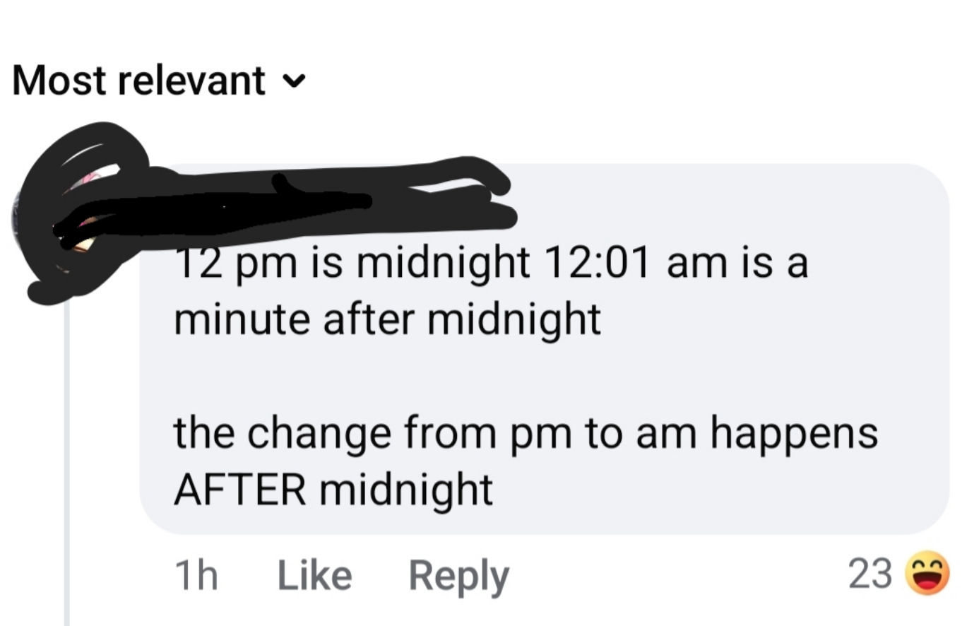 I don't understand how someone can think 120 minutes is the same thing as an hour and 20 minutes. I'm a Senior Staff Writer who writes a wide range of topics, spanning from people's real-life drama to pop culture to funny things I find on the internet. "I was just about to check FB Marketplace for a Sony Lens after some Reddit scrolling. Nevermind. Unfortunate situation, luckily it's caught on camera. A few hundred dollars isn't worth dying over." "Dye = a natural or synthetic substance used to add a color to or change the color of something. Learning the meaning of words before posting isn't difficult. Dieing means to die. As in death or not alive. Additionally, never mind is two words, not one." Post:“Did you know: mammals cannot be green.” Reply by user 1:“Kermit would like a word” Reply by user 2:“Kermit is not a mammal” Reply by user 1:“Lmao of course he’s a mammal his surname is literally ‘the frog’” “The president, and the president alone, has the authority to decide how to allocate funding. Nobody has the right to review or pass judgement on his actions.” Comment 1:“18th century but whatever lol...im from the 19th...” Reply by user 1:“.... I highly doubt you are over 126 years old” Reply by user 2:“was still born before 2000 and definitely not 1809 so what period was i born in again cause it wasnt 20th century or 18th...goofball” Reply by user 1:“being born between 1901 and 2000 means you were born in the 20th century.we are currently in the 21st century .... goofball” Reply by user 2:“I was still born in the 1900 jackass” Reply by user 1:“................ the 1900s are 20th century......How many time will I have to tell you before you check how centuries work ?” “Ladies, it finally happened. I just had a mansplaining so epic it will never be topped. I just had a man ask me why I chose to be a widow. I said "I'm sorry, but that's not something you choose." He said "You just need to open your heart and let someone love you instead of choosing to stay a widow". I said "What do you think widow means exactly?" This man said "A widow is when a woman gives up on dating and stays alone for the rest of her life." I said "That is not what that means". HE SAID...” Comment by user 1:“Poor thing. I'm not eating beef anymore.” Reply by user 1:“The only problem is... beef is in all of my favorite foods (Spaghetti bolognese, hot dogs, hamburgers etc..) so now I don't know what to even eat, lol.” Reply by user 3:“HAMburgers aren’t beef. Neither is hotdogs. They’re pig” Post: "Spanish is a LANGUAGE 🥴🥴🥴🥴 people aren't Spanish 😭🥴" “There’s no thing as 'Rabies', it’s never been proven to exist. Rabid animals are usually starving and in a highly stressed state. I’d wash my wound with CLO2 and not worry about it.” “How about just don’t cheat on your spouse and then they won’t divorce you over infidelity” “Cheating makes marriages stronger, sexual frustration ruins them.” “Proof that airplanes aren't real. We don't have that kind of technology as humans, it's impossible to fly in the air. Throw a feather into the air and it comes down. No way thousands of pounds of metal is able to fly. When you book a flight it's using demonic technology, using demon energy to transport you to your destination. The "X-rays" at tsa transmit signals to your brain to convince you that this demonic technology is actually human technology. I will never fly in a "airplane" the airplanes you think you see are holograms using the same demonic technology. Even if we could somehow fly using non demonic human technology the government wouldn't let us , because it would prove the earth is flat” “The Sun hasn't been invented yet. No we can't make something like that happen. Yes you can pretend you have a formula for what compounds you need, but nothing does what the Sun is said to do. We need something that can have other objects move around it and off the ground going around it. Plus we need it also happening without power leading into it, like an electric powering up to it, etc. All that has to be operating off world and in a vacuum known as space. Very tricky to prove that's what this is that people say it is. Proving is done using experimentation and that's not proven in any way shape or form.” "Why can’t you give a baby under a year honey?" Comment 1:“Am I the only one thinking that honey has to be some sort of like golden formula that you should give your babies as much as possible if the government is trying so hard to push against it? 🤔” Reply (Author):“I was actually thinking kinda the same. I don’t trust the WHO or FDA” Comment 2:“I gave my boys honey before the age of 1. I do not nor will never trust anything that the FDA, WHO, or
