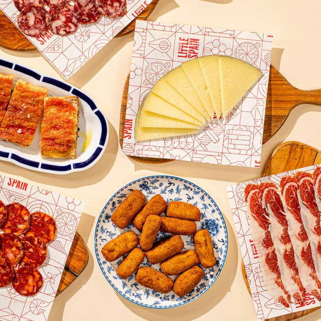 This spread serves up to six people and includes 12 chicken croquetas, a loaf of Cristal bread with a pint of fresh tomato spread for pan con tomate, Manchego cheese, jamón Ibérico, salchichon Ibérico de bellota, and chorizo Ibérico de bellota.