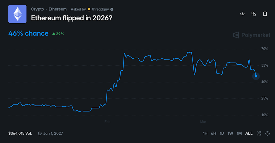At the time of reporting, the odds have fallen to roughly a 46% probability that Ethereum gets flipped sometime this year.