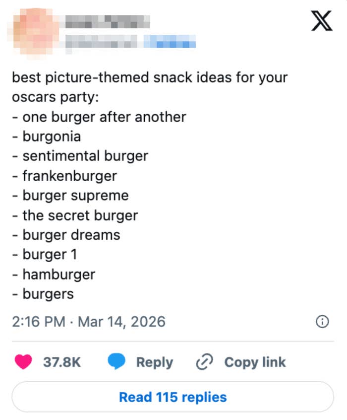 Hiiiii, I'm Bella, a Costa Rican-American writer based in Southern California on the trending news team here at BuzzFeed. Editor's Note: While we can't endorse what X has become, we can bring you the worthwhile moments that still exist there, curated and free of the surrounding chaos. “and the winner of best actor goes to… what the hell? HUDSON WILLIAM!” pic.twitter.com/Ek9qGShmme not predicting the oscars this year just along for the ride pic.twitter.com/BUAiHg9GLj Timmy is gonna do this as an apology to the opera community if he wins pic.twitter.com/rCjqgwqviI what if he starts doing this mid acceptance speech as a tribute and an apology to the opera and ballet people pic.twitter.com/xkNf1bPaot “and the oscar goes to…. RYAN COOGLER” pic.twitter.com/pXdlh33jwS