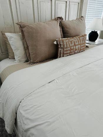 "10/10. Would buy again. I absolutely love this duvet cover. I bought it to replace my West Elm duvet cover and can't believe how much I love it. It is incredibly soft and was easy to put on my duvet with the ties that come built-in. It is a great quality for a very reasonable price. I bought a full-size duvet cover for my queen-size duvet, and it fits perfectly to give that fluffy duvet look." —Laura Baggaley