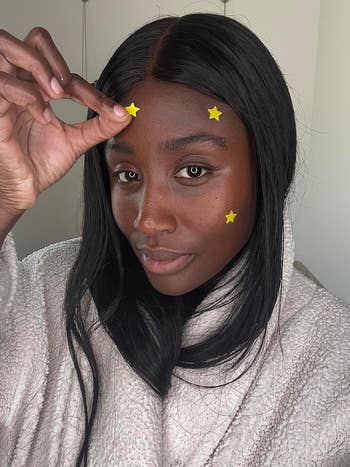 Promising review: "I LOVE the look of pimple patches on myself (as weird as that sounds) and absolutely hate the semi-clear ones, since they just draw my eyes to something that’s SUPPOSED to be invisible. So I easily fell in love with the Starface pimple patches — but the issue with those is they’re SO expensive and don’t work at all. THESE, however, have immediately sucked everything out of my face. I love them and literally wear them all the time. So many people have complimented me, saying, 'Oh my gosh, I love how you just wear stickers on your face; it’s adorable.' These also work as an alternative to the TikTok Shop ones that are really popular right now and are cheaper! 10/10 from me :)" —evalyn evoke