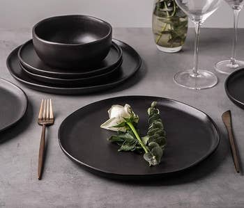 Promising review: "These are awesome! Perfect thickness (not too thin and not too thick). I love the wavy appearance. Matte black has a sort of sheen to it and it's just lovely. These look amazing on my open shelving in my black walnut kitchen. They are LARGE, too. Awesome pasta/salad plates." —C. Mah