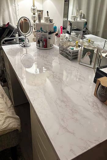 It took most reviewers less than an hour to completely revamp their desks, and it was two hours *tops* for others (depending on how much space you're redoing!). Psst: If you pick this up, check out this reviewer's great installation tips for applying it to a desk!