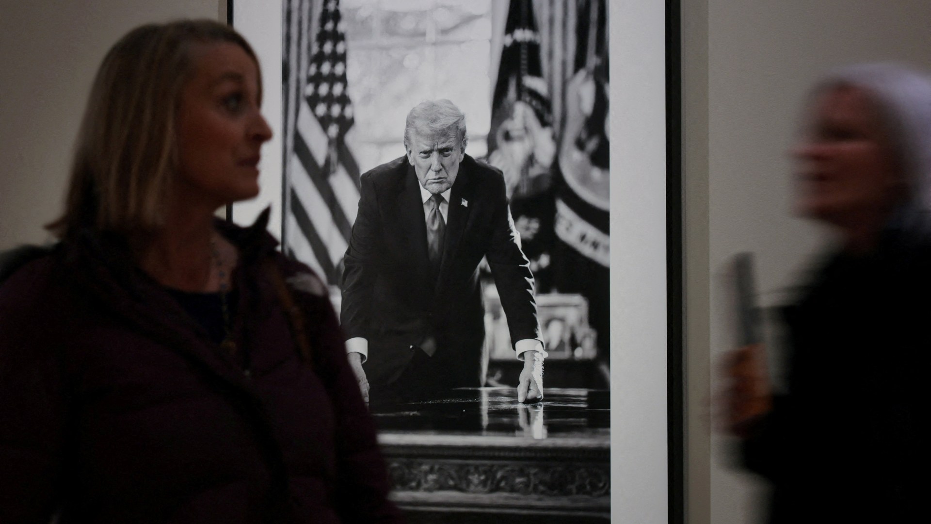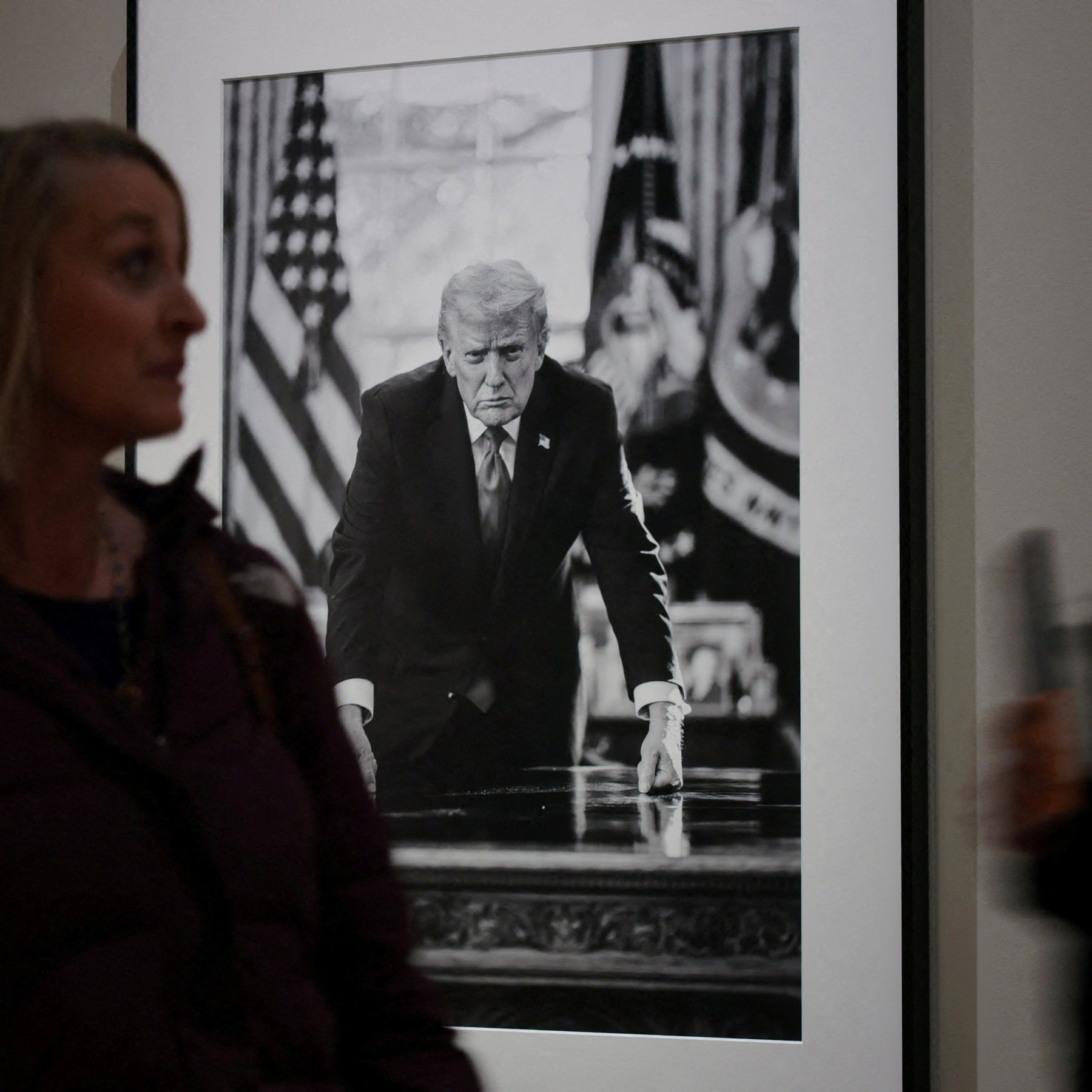 The image is a facsimile of a black-and-white image of Trump taken by photographer Daniel Torok and featured in the National Portrait Gallery in Washington, DC.