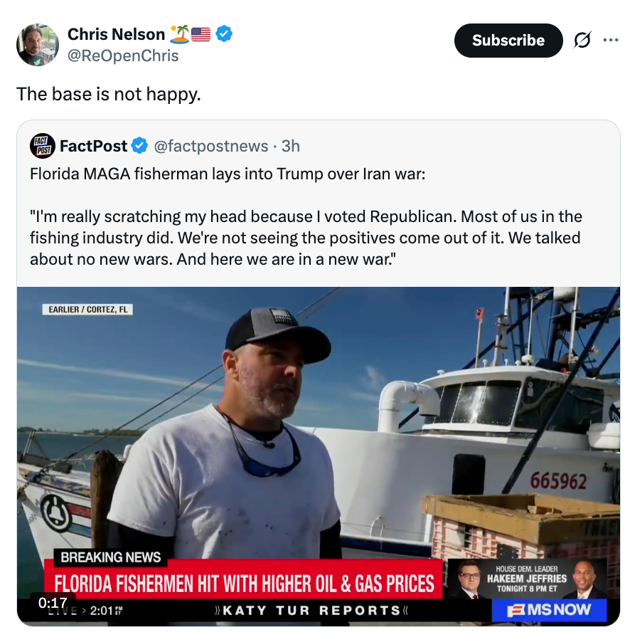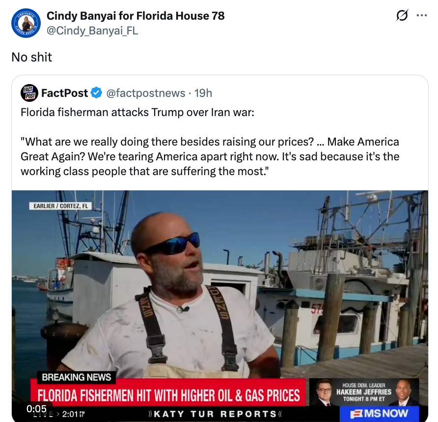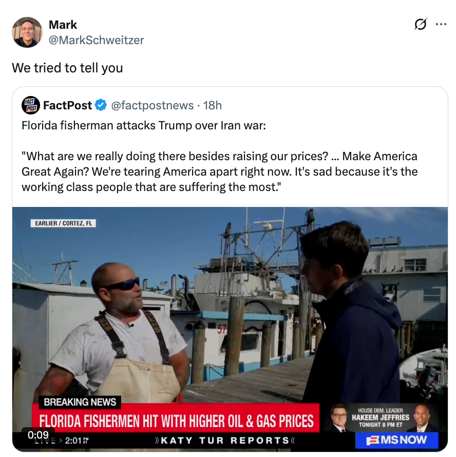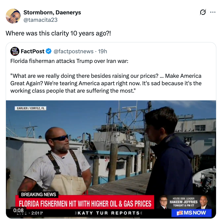 Florida MAGA fisherman lays into Trump over Iran war:"I'm really scratching my head because I voted Republican. Most of us in the fishing industry did. We're not seeing the positives come out of it. We talked about no new wars. And here we are in a new war." pic.twitter.com/7L5d9z7AUE