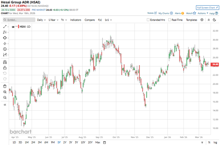 Recently, Hesai Group (HSAI) joined NVIDIA's (NVDA) Halos AI Systems Inspection Lab, the first ANSI National Accreditation Board (ANAB) accredited inspection lab for AI-driven physical systems. As a member of this lab, Hesai will evaluate and validate its LiDAR (Light Detection and Ranging) platforms within this unified AI compliance, safety, and cybersecurity framework. Earlier, the company was selected by NVDA to enable level 4 fleet deployment for NVIDIA DRIVE Hyperion 10, a compute-and-sensor architecture. Physical AI is gaining significant traction, especially as NVDA eyes a major push to accelerate the technology. This push also places LiDAR at the forefront, and Hesai is likely to play a major role. Micron Technology Hikes Its Dividend 30% Due to Surging FCF - MU Is Worth 34% More - What's the Best Play? As Trump Admin Warns on Airport Closures, Should You Sell Delta Airlines Stock? Iran War, Oil Volatility and Other Key Things to Watch This Week Markets move fast. Keep up by reading our FREE midday Barchart Brief newsletter for exclusive charts, analysis, and headlines. According to one estimate, the physical AI market is expected to grow at a 32.5% CAGR to $49.73 billion by 2033. Against this backdrop, Hesai plans to double its annual production capacity in 2026 from 2 million units to over 4 million units, driven by accelerating demand for ADAS and robotics LiDAR. Headquartered in Shanghai, China, Hesai Group specializes in developing and manufacturing advanced three-dimensional LiDAR solutions for autonomous vehicles, robotics, and industrial applications. The company integrates in-house research, design, and production to deliver high-performance sensors used in advanced driver assistance systems, mapping, and logistics robots. With a global presence, Hesai focuses on innovation to meet growing demand in the automotive and automation sectors. The company has a market capitalization of $3.41 billion. Robust LiDAR demand in the autonomous driving and ADAS segments fueled revenue expansion and profitability turnaround, alongside strong sentiments. Over the past 52 weeks, the stock has gained 17,45%, while it has been up only marginally year-to-date (YTD). The company’s shares reached a 52-week high of $30.85 in September 2025, but are down 27% from that level. On a forward-adjusted basis, Hesai’s stock’s price-to-earnings ratio of 54.11x is significantly higher than the industry average of 14.41x. For the third quarter of fiscal 2025, Hesai reported 47.5% year-over-year (YOY) growth in its net revenues to RMB795.40 million ($111.73 million). Hesai Group's product revenues reached RMB790.10 million ($111 million), up 57% from the prior year’s same quarter. This growth stemmed primarily from higher sales of ADAS and robotics LiDAR products, fueled by strong demand across China and international markets. The company’s non-GAAP EPS grew significantly YOY to $0.28. For the fourth quarter (to be reported on Mar. 24, before the market opens), Hesai Group anticipates net revenues ranging from RMB1 billion ($140 million) to RMB1.20 billion ($169 million), reflecting a YOY growth of roughly 39% to 67%. Wall Street analysts are robustly optimistic about Hesai’s future earnings. For fiscal 2026, EPS is projected to surge 105.4% annually to $0.76. Last year, Wall Street analysts gave their bullish takes on the stock. Analysts at CICC initiated coverage of Hesai Group with an “Outperform” rating and a $23.50 price target, reflecting optimism about the company’s fundamentals and its ability to execute its business plan. Goldman Sachs analysts raised Hesai Group’s price target from $26.30 to $36 and maintained a “Buy” rating. The analysts cited expanding LiDAR adoption in China and upcoming global production as reasons for this price target update. In addition, Goldman Sachs is significantly bullish on Hesai’s fundamentals, expecting a net margin of approximately 21% by 2030. Last year, UBS analysts also initiated coverage of Hesai Group with a “Buy” rating and a $35 price target. UBS expects the company to become the world’s largest ADAS LiDAR supplier for passenger vehicles from 2025, driven by its partnerships with EV startups and autonomous mobility service providers. Analysts highlighted Hesai’s recent entry into the supply chains of top-selling domestic OEMs. Hesai Group has become popular on Wall Street, with analysts awarding it a consensus “Strong Buy” rating overall. Of the 12 analysts rating the stock, a majority of nine analysts have rated it a “Strong Buy,” two analysts suggest a “Moderate Buy,” while one analyst is playing it safe with a “Hold” rating. The consensus price target of $33.20 represents 47.6% upside from current levels. Moreover, the Street-high price target of $38.10 indicates a 69.3% upside. On the date of publication, Anushka Dutta did not have (either directly or indirectly) positions in any of the securities mentioned in this article. All information and data in this article is solely for informational purposes. This article was originally published on Barchart.com