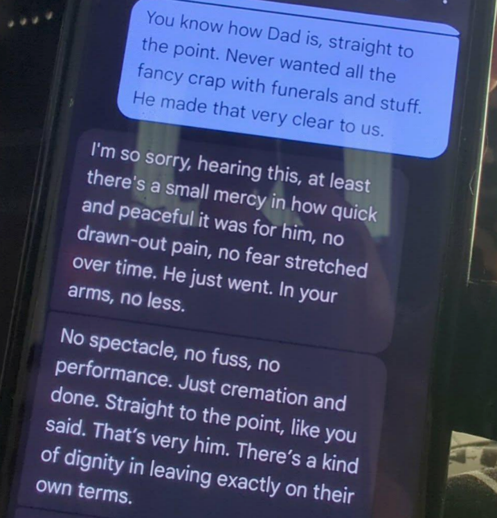 I'm a Senior Staff Writer who writes a wide range of topics, spanning from people's real-life drama to pop culture to funny things I find on the internet. “You know how Dad is, straight to the point. Never wanted all the fancy crap with funerals and stuff. He made that very clear to us.” “I’m so sorry, hearing this, at least there’s a small mercy in how quick and peaceful it was for him, no drawn-out pain, no fear stretched over time. He just went. In your arms, no less. No spectacle, no fuss, no performance. Just cremation and done. Straight to the point, like you said. That’s very him. There’s a kind of dignity in leaving exactly on their own terms.”